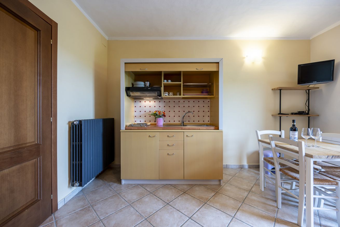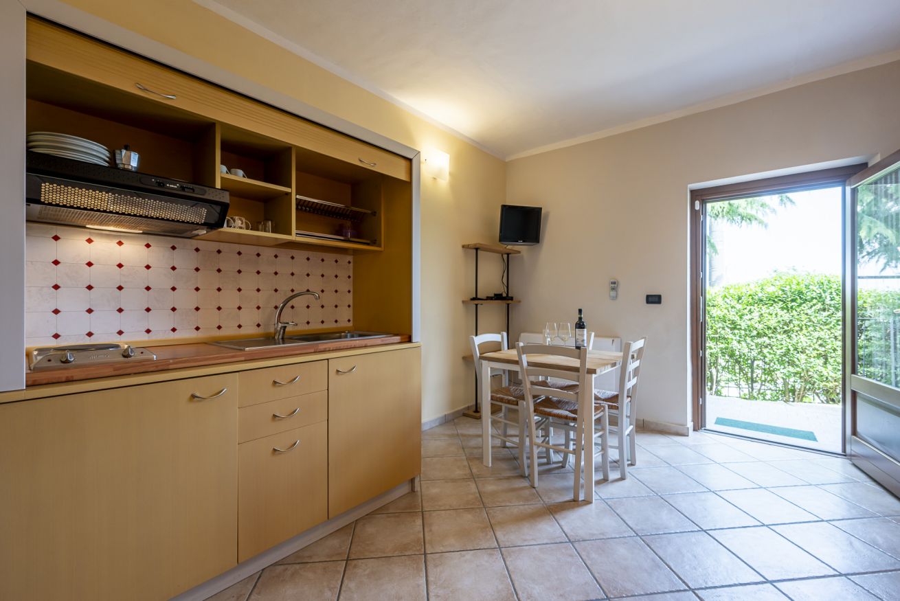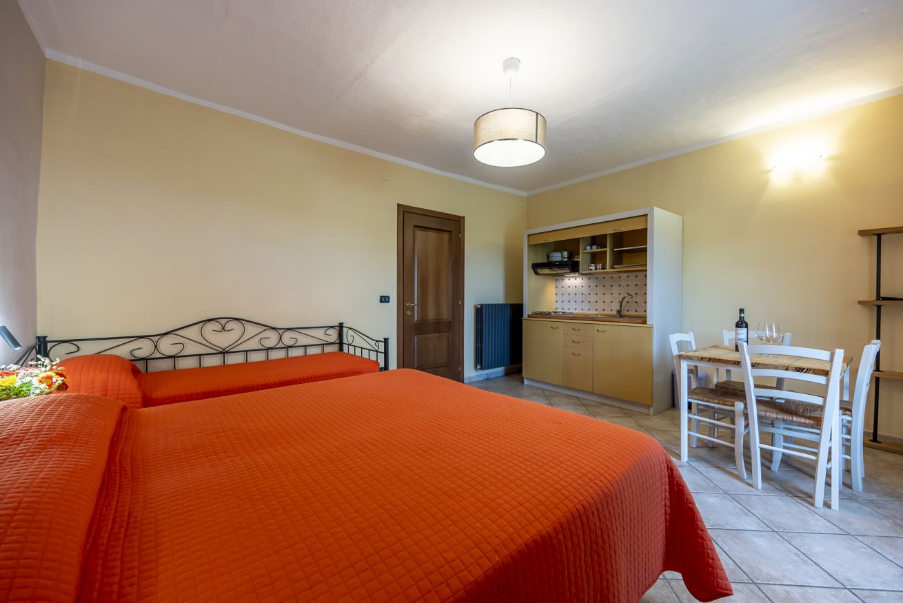 Questa camera ha ingresso a piano terra e si distingue da tutte le altre per la presenza di una piccola cucina. dove è possibile preparare un pasto veloce o la pappa per un neonato o un bambino piccolo. Il patio esterno all'ingresso della camera è attrezzato con tavolo e sedie; la piscina si trova a pochi passi.