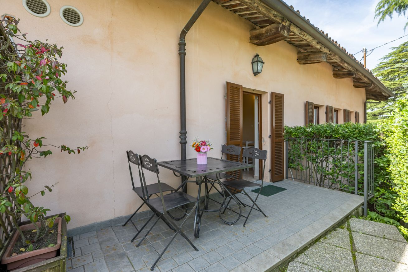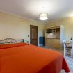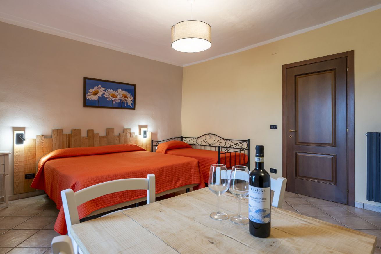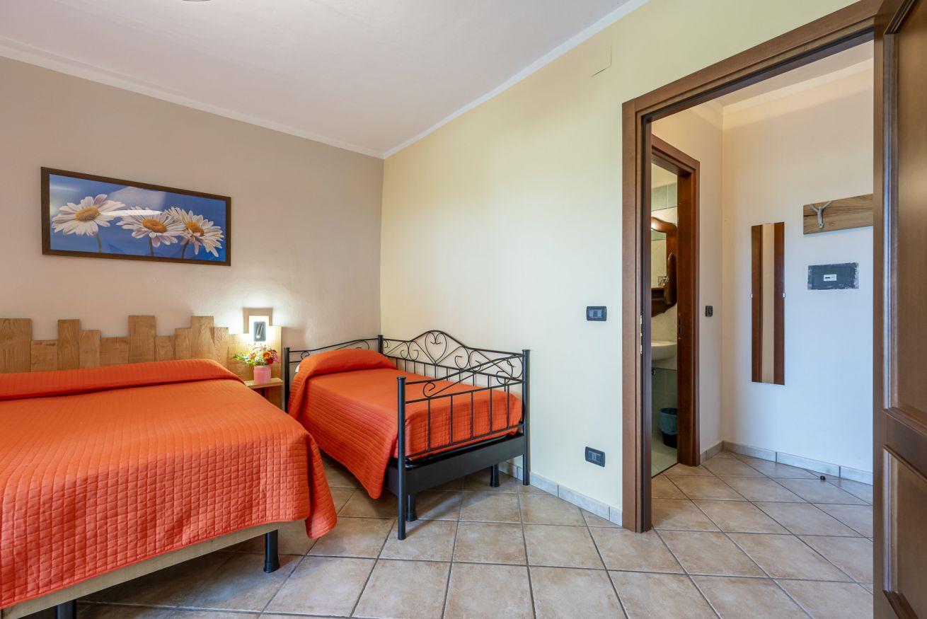 Questa camera ha ingresso a piano terra e si distingue da tutte le altre per la presenza di una piccola cucina. dove è possibile preparare un pasto veloce o la pappa per un neonato o un bambino piccolo. Il patio esterno all'ingresso della camera è attrezzato con tavolo e sedie; la piscina si trova a pochi passi.